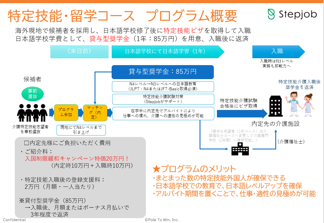 医療・介護の外国人人材サービスStepjobでは、各国現地教育機関と協定し留学生として来日、卒業後に特定技能介護として就労プログラムを提供しております。今般の外国人新規入国緩和の措置を経て、2022年4月期のプログラム生約20名が来日予定となりました。この入国緩和を記念いたしまして、ご紹介料20万円の特別キャンペーンを実施いたします。
