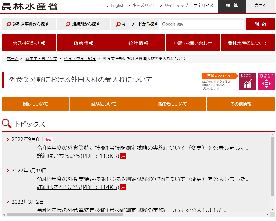特定技能介護の管轄の官庁が厚労省なのに対して、特定技能外食の管轄は農水省となります。