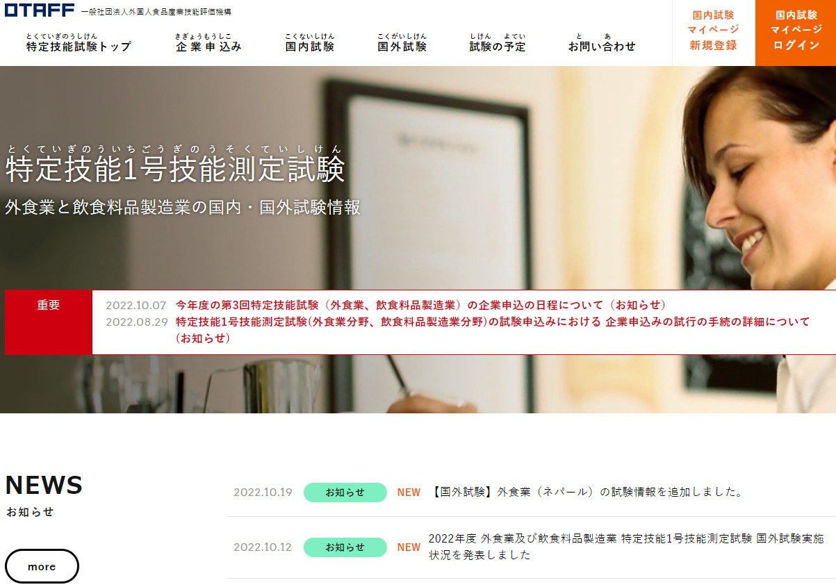 特定技能外食の試験は一般社団法人外国人食品産業技能評価機構(OTAFF)により、国内および海外で実施されています。