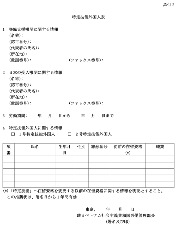 Giấy tiến cử kỹ năng đặc định do đại sứ quán Việt Nam tại Nhật Bản cấp. Các xí nghiệp hoặc cơ quan hỗ trợ đăng ký sẽ có trách nhiệm xin giấy nếu ứng viên đỗ phỏng vấn.
