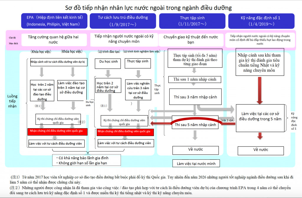 Hiện nay thời gian lưu trú của chương trình kỹ năng đặc định là 5 năm. Tuy nhiên, với duy nhất ngành điều dưỡng, nếu thi đỗ kỳ thi quốc gia nhận chứng chỉ điều dưỡng viên, nhận được visa điều dưỡng thì bạn có khả năng lấy được quyền vĩnh trú ở Nhật.