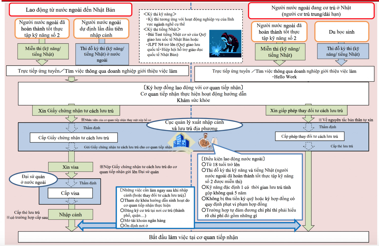 Trên đây là toàn bộ những điều kiện cần thiết để có thể chuyển đổi sang tư cách lưu trú kỹ năng đặc định. Quy trình thủ tục chi tiết của quá trình đăng ký được tóm tắt trong ảnh sau. Các bạn có thể xem thêm tài liệu sau do Đại sứ quán cung cấp.