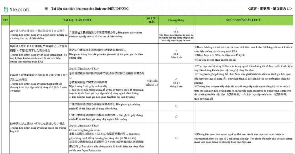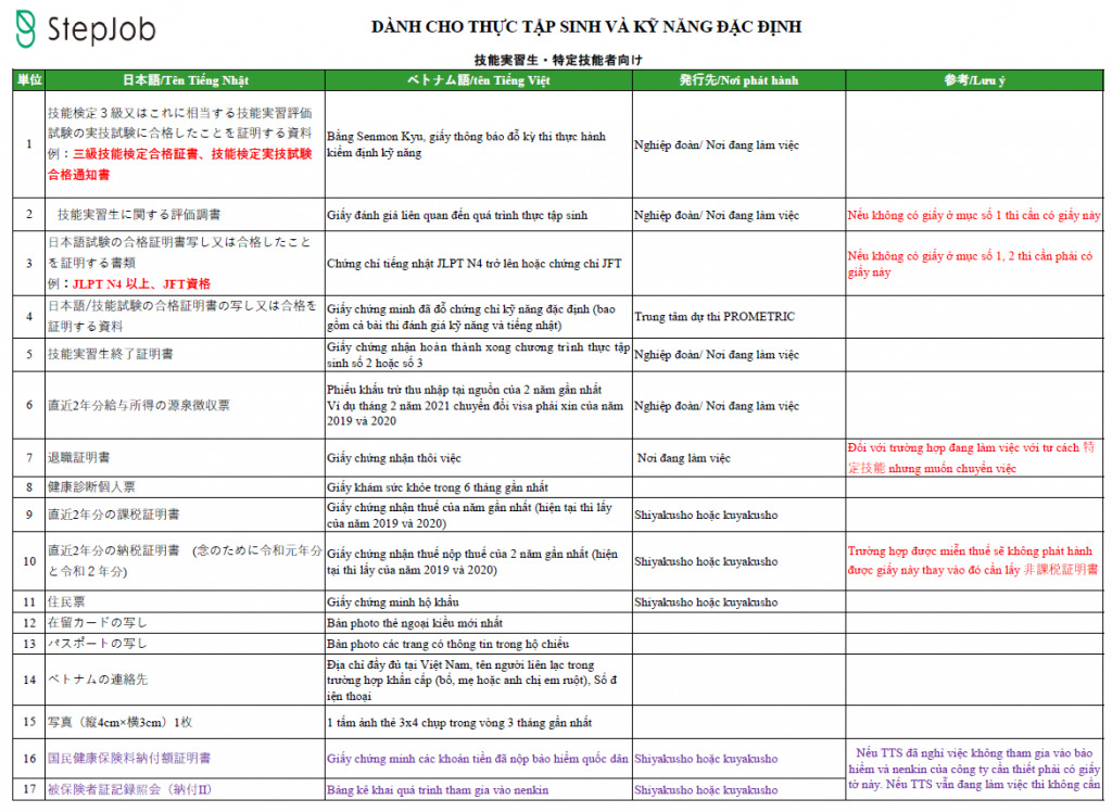 Vì chuyển đổi cùng ngành nghề nên trong 17 loại giấy tờ kể trên, thực tập sinh số 2, 3 sau khi hoàn thành tốt chương trình thực tập sinh sẽ được chuyển sang chương trình kỹ năng đặc định số 1 mà không cần phải thi kỳ thi đánh giá kỹ năng đặc định, do đó không phải nộp các giấy tờ ở mục số 4 như bảng trên.