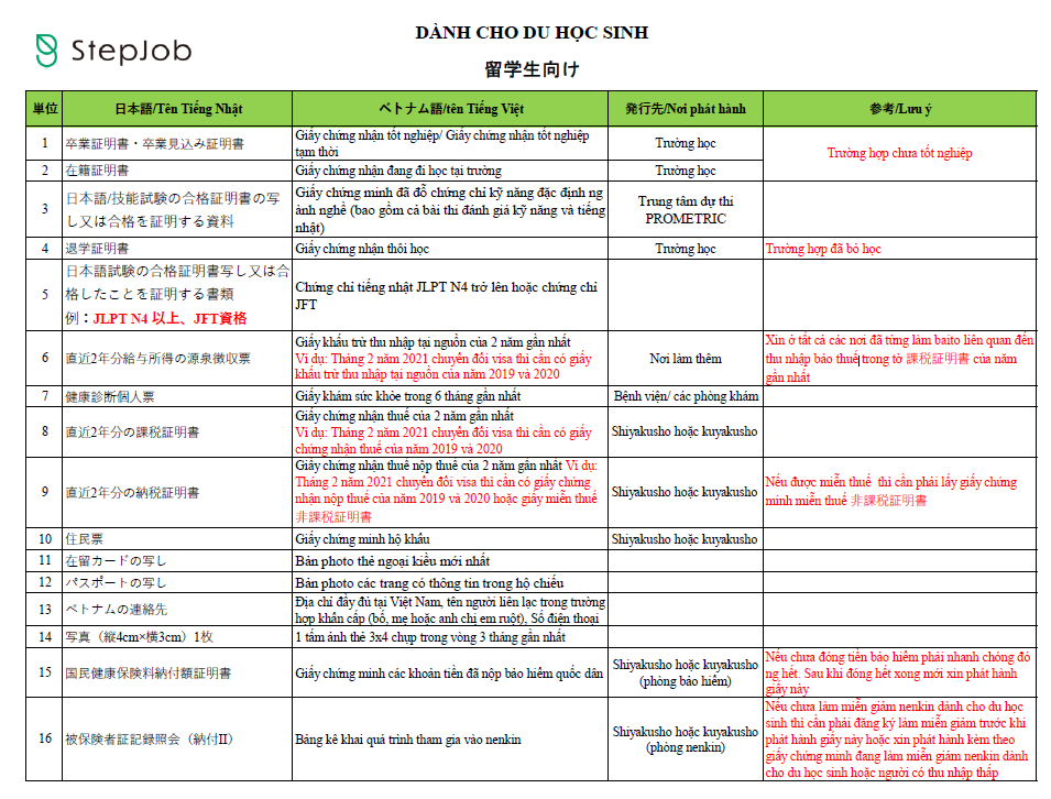 2.4 Các giấy tờ cần chuẩn bị đối với du học sinh chuyển sang kỹ năng đặc định số 1 được tóm tắt trong bảng sau: