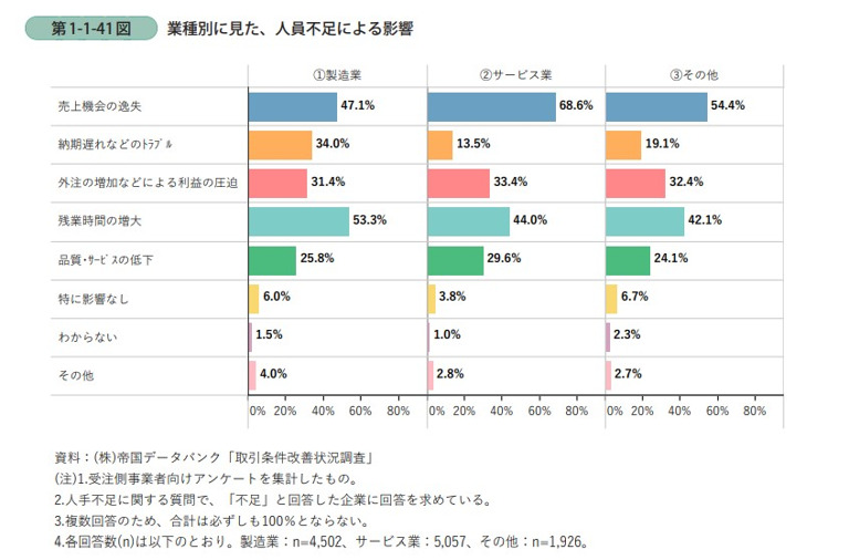 人手不足が続く中、多くの企業は廃業や倒産のリスクに直面しています。さらに、日常の業務にも影響が出ているのが実情です。製造業からサービス業に至るまでの各業種で行われた「人員不足による影響」のアンケートによれば、最も多い懸念点として「売上機会の逸失」や「残業時間の増大」が挙げられました。さらに、利益が圧迫される「外注の増加」や「納期の遅れ」などの業務上のトラブルも、人手不足の影響を受ける点として指摘されています。
