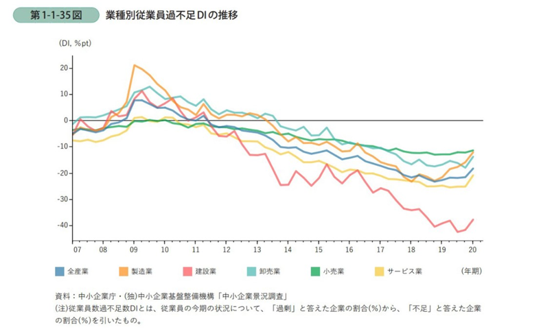 中小企業における人手不足は、特に深刻な課題として浮上しています。中小企業庁が発表した「2019年度の中小企業の動向」のデータによれば、製造業からサービス業に至るまでの各産業で、従業員数の過剰や不足を示す指標「従業員数過不足数DI」が2013年の第4四半紀からマイナスを記録しています。この指標は、人手の過剰を感じている企業と不足を感じている企業の差を示しており、その結果、多くの産業で人手不足の感覚が強まっていることを物語っています。一部の業種での改善の兆しも見られるものの、全体としての人手不足感は続く傾向にあります。